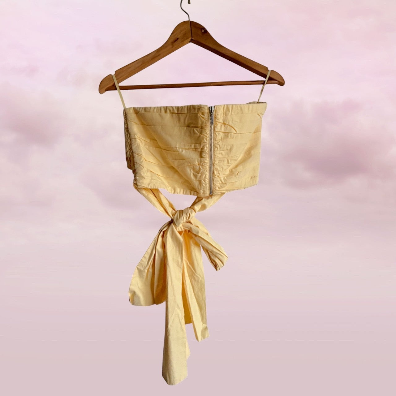 Sun-drenched and event-ready, this Bec + Bridge Fia set is a dreamy two-piece made for moments that call for something special. Featuring the signature bandeau wrap top and flowing pleated asymmetrical midi skirt, this soft butter-yellow set is effortlessly feminine with a modern romantic edge.